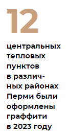 В 2023 году 12 центральных тепловых пунктов в различных районах Перми были оформлены граффити — картинами, которые создают уличные художники — как профессионалы, так и любители. Основной тематикой стало празднование 300-летия Перми и 65-летия Пермских тепловых сетей. Например, в Кировском районе Перми появился пермский символ — медведь, автор работы — современный художник Макс Weer (Вир). Мурманские художники Дмитрий Новицкий и Вероника Вологжанникова оформили тепловой пункт в микрорайоне Островском динамической композицией «Пермь, вперёд!». Авторы использовали узнаваемые образы нашего города: «Счастье не за горами», река Кама, а также индустриально-промышленный мотив (трубопроводы).