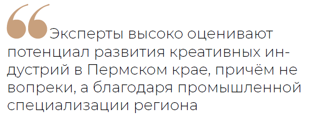 Эксперты высоко оценивают потенциал развития креативных индустрий в Пермском крае, причём не вопреки, а благодаря промышленной специализации региона. «Как раз индустриальный регион с высокой средней заработной платой, с большой численностью благополучного, трудоустроенного населения и детей — самая благоприятная среда для развития креативной индустрии. Когда человек сыт, трудоустроен, живёт в благополучном районе, — после «хлеба» ему хочется «зрелищ», — говорит Юлия Стародумова.