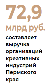 Есть и другие метрики: в Пермском крае в отраслях, относящихся к креативным индустриям, зарегистрировано 11,7 тыс. организаций, или 3,5% от их общего количества. Их суммарная годовая выручка равна 72,9 млрд руб., или 2,5% суммарной выручки всех организаций региона. Тот факт, что численность жителей Прикамья, занятых в творческих профессиях, на протяжении последних пяти лет увеличивалась, в ЦМИЧП НИУ ВШЭ считают косвенным признаком ускоренного развития креативных индустрий в регионе.
