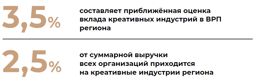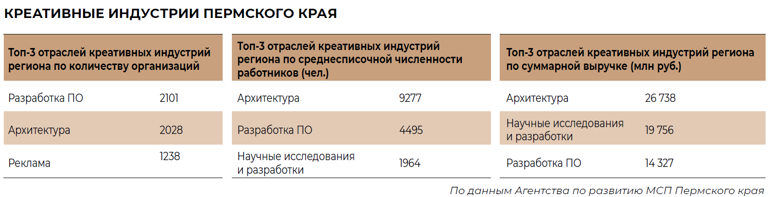 Лидерами по доле креативных индустрий в валовом региональном продукте (ВРП) являются Москва, Санкт-Петербург, Тюменская, Калининградская, Новосибирская, Костромская, Ярославская, Ульяновская области, Республика Татарстан, Свердловская и Московская области. В АСИ предлагают также сопоставлять этот показатель с долей занятых в секторе. Если его доля в ВРП выше доли занятых, то сектор производит продукт с высокой добавленной стоимостью. Однако таких регионов мало и Пермский край к ним не относится. В нашем регионе на долю креативных индустрий, по данным АСИ, приходится 3,5% валового регионального продукта, при этом сектор обеспечивает 8,5% всех рабочих мест, то есть даёт работу 20,6 тыс. человек.