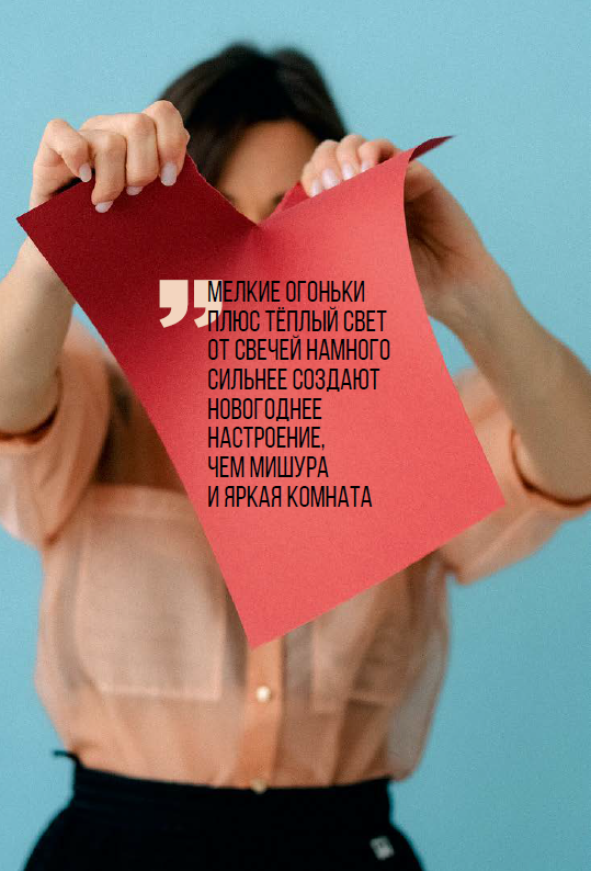 Не нужно тащить в дом мишуру и всё, что сделано из искусственных материалов и долго перерабатывается. Мишура не добавляет красоты. Лучше создать праздничную атмосферу. Купить красных и белых свечей, можно в форме ёлочки, и расставить по дому, зажигать их по вечерам. Ещё вариант — поставить эти свечи на большой поднос и зажечь.