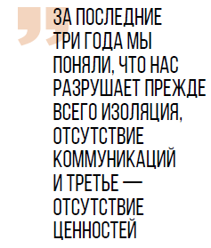 За последние три года мы поняли, что нас разрушает прежде всего изоляция, отсутствие коммуникаций и третье — отсутствие ценностей. Они просто стёрлись, нивелировались. Значит, нужно их возродить.