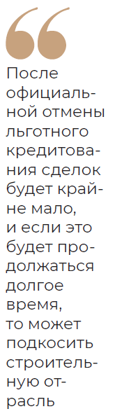 Можно сказать, что отмена льготной ипотеки уже произошла, считает Регина Давлетшина. «Откровенно говоря, если государство не субсидирует ставку по ипотеке и перекладывает её на застройщиков, то это просто маркетинговый ход, который, как в математической формуле, выносит сумму за скобки. Это в любом случае означает, что долговую нагрузку в полном объёме оплатит заёмщик. Поэтому фактически льготная ипотека в стране уже сведена к нулю», — говорит эксперт. Она считает, что полностью рынок не остановится, поскольку всегда будут желающие и имеющие возможность покупать даже за наличку или, может быть, по стандартной ипотечной программе. Но после официальной отмены льготного кредитования сделок будет крайне мало, и если это будет продолжаться долгое время, то может подкосить строительную отрасль.