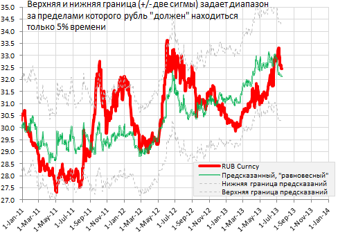 Разбег между модельным курсом и наблюдаемым сейчас составляет 1% (32.44 руб./$ рыночный и 32.11 руб./$ - “предсказанный” нефтью на $109,3/барррель Юралз)