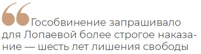 Защитник также отметил, что суд, «можно сказать, пошёл нам навстречу», поскольку гособвинение просило шесть лет. Лопаевой зачли пребывание под стражей, под домашним арестом и ограничительные меры. «Фактически полтора года останется», — сказал адвокат. Сейчас Лопаева находится в следственном изоляторе. Она будет там до рассмотрения апелляционной жалобы. Один день нахождения в СИЗО ей засчитают за полтора дня колонии общего режима.
