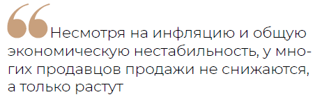 Алёна Денисенко подтверждает, что, несмотря на инфляцию и общую экономическую нестабильность, у многих продавцов продажи не снижаются, а только растут.