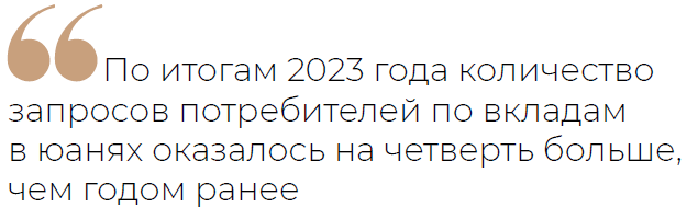 По итогам 2023 года количество запросов потребителей по вкладам в юанях оказалось на четверть больше, чем годом ранее. Вкладчики использовали этот инструмент для диверсификации сбережений и получения дополнительного дохода за счёт курсовой разницы из-за падения курса рубля.