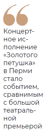 Концертное исполнение «Золотого петушка» в Перми стало событием, сравнимым с большой театральной премьерой. Социальные сети и живые разговоры наполнились диалогами о том, как актуально звучит в наши дни эта вещь, как реальный контекст наполняет её смыслами. Между тем это ведь не вполне постановка, и все трактовки здесь касались исключительно музыки. Именно музыкальная интерпретация придала опере более чем столетней давности свежее и актуальное звучание, побуждающее к размышлениям.