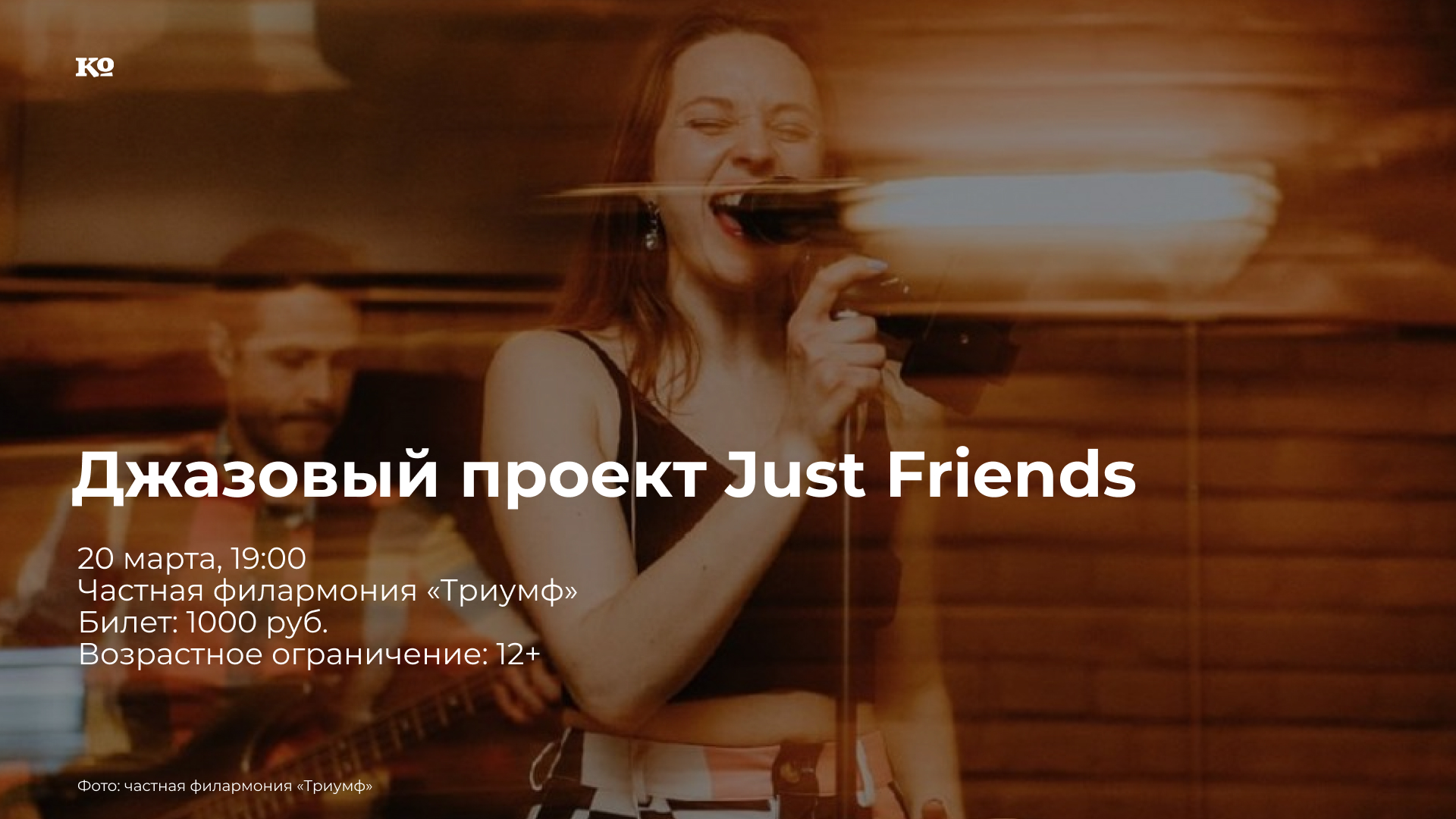 Концерт для тех, кто любит яркую музыку джаза и не только, а также стильные вечера в «Триумфе». В программе — джаз и соул. Музыканты группы Just Friends создают новые необычные аранжировки и добавляют яркие композиции, в которые публика влюбляется с первых секунд. Визитной карточкой коллектива является мощный голос певицы Екатерины Смирновой. Организаторы обещают, что, придя на выступление, вы точно захотите петь и танцевать вместе с ней, забудете обо всём и перенесётесь в атмосферу зажигательной вечеринки.