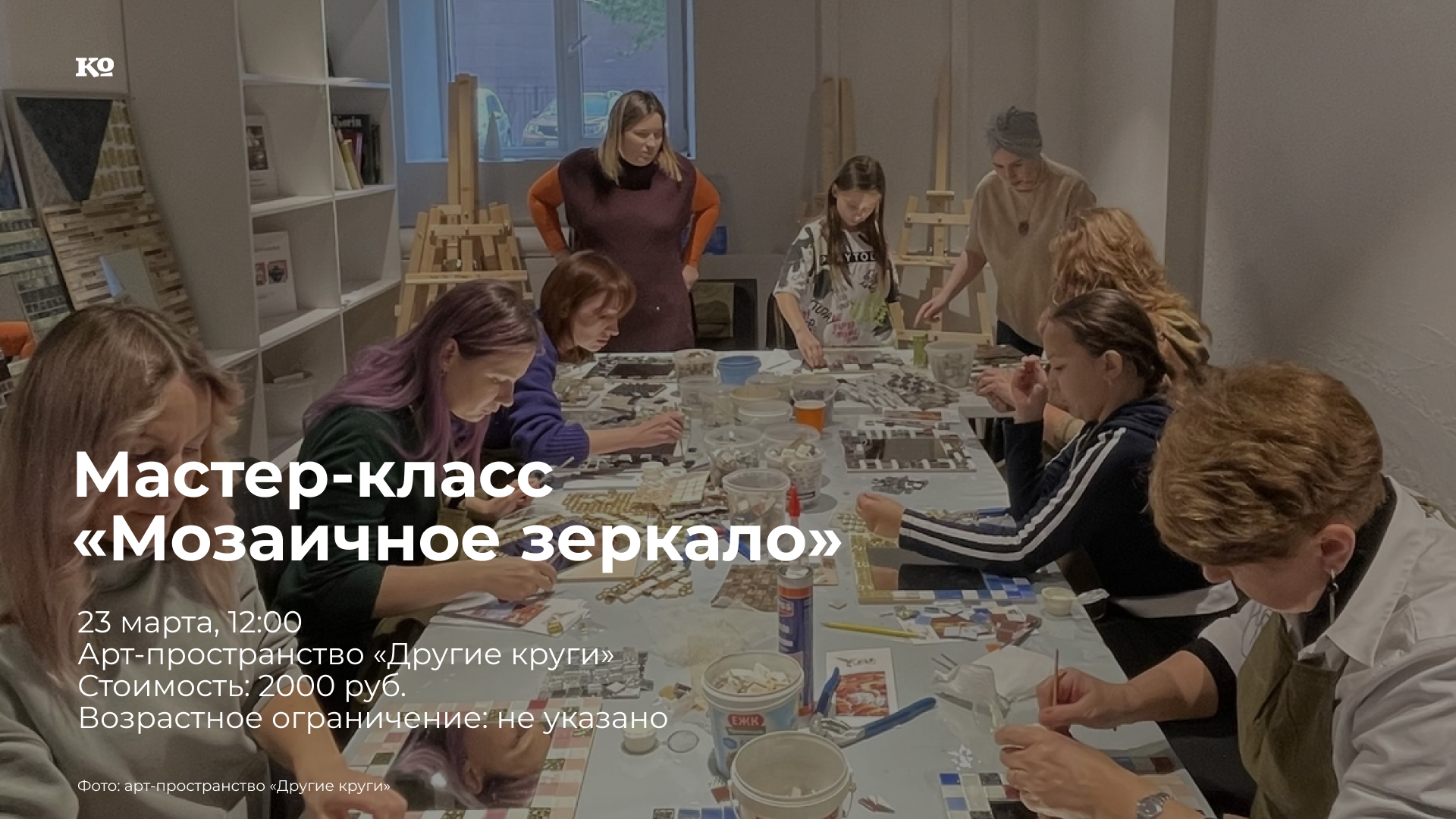 В субботу в стенах арт-пространства пройдёт мастер-класс художника-мозаичиста Надежды Пановой «Мозаичное зеркало». Участники вместе с мастером придумают и составят мозаичную композицию из стекла, камня, керамики, гальки, металла, перламутра, бамбука, пуговиц и ракушек, узнают секреты работы с мозаикой и профессиональным инструментом. Все материалы входят в стоимость мастер-класса.