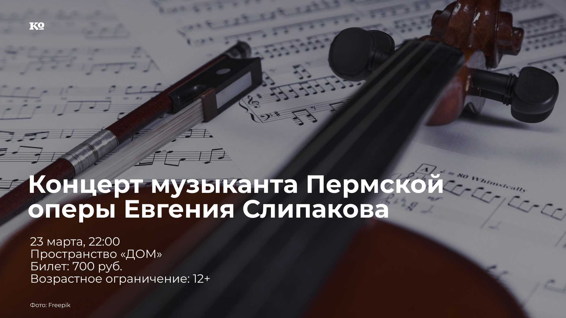 Артист Пермского театра оперы и балета им. Чайковского, скрипач Евгений Слипаков впервые выступит с сольным концертом. Мероприятие станет частью проекта Late Night Concert — ночных концертов в «ДОМЕ» под мерцание свечей. Для гостей прозвучит музыка композиторов XIX-XX веков. В программе — пьесы с элементами славянских, румынских, венгерских танцев. Партию фортепиано исполнит Анастасия Иванова, лауреат международных конкурсов, концертмейстер Пермской оперы.