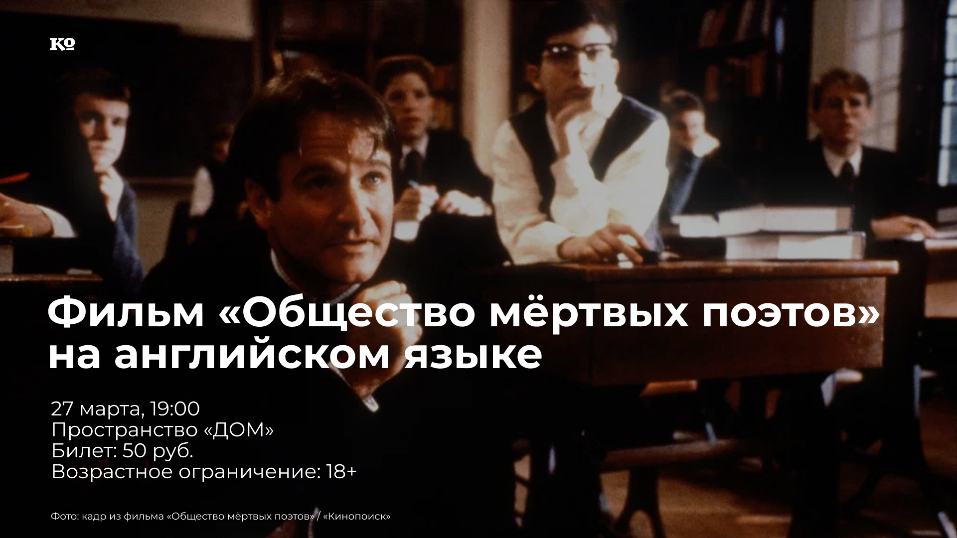 Встреча состоится в рамках проекта «ДОМА» DOM English club. На этот раз участники клуба посмотрят драму режиссёра Питера Уира «Общество мёртвых поэтов» (англ. Dead Poets Society). Фильм рассказывает о группе необычных учеников и их новом учителе литературы, который вдохновляет их на то, чтобы ценить искусство и свободу мысли вопреки строгим правилам традиционной школы. Картина исследует темы личностного роста, кризиса среднего возраста, значимости образования и непреходящих ценностей в быстро меняющемся мире.