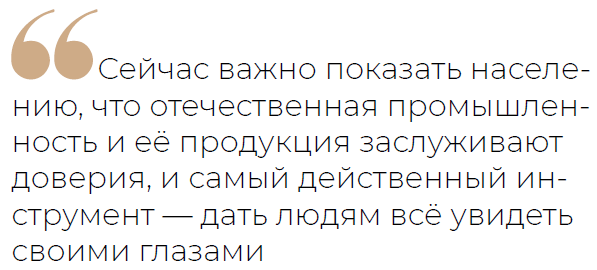 «Кроме того, интерес к российскому производству существенно вырос в связи с трендом на импортозамещение. Сейчас важно показать населению, что отечественная промышленность и её продукция заслуживают доверия, и самый действенный инструмент — дать людям всё увидеть своими глазами», — говорит эксперт.