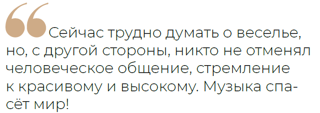 — Для меня лично сейчас очень сложная ситуация: с одной стороны, сейчас трудно думать о веселье, но, с другой стороны, никто не отменял человеческое общение, стремление к красивому и высокому. Музыка спасёт мир!
