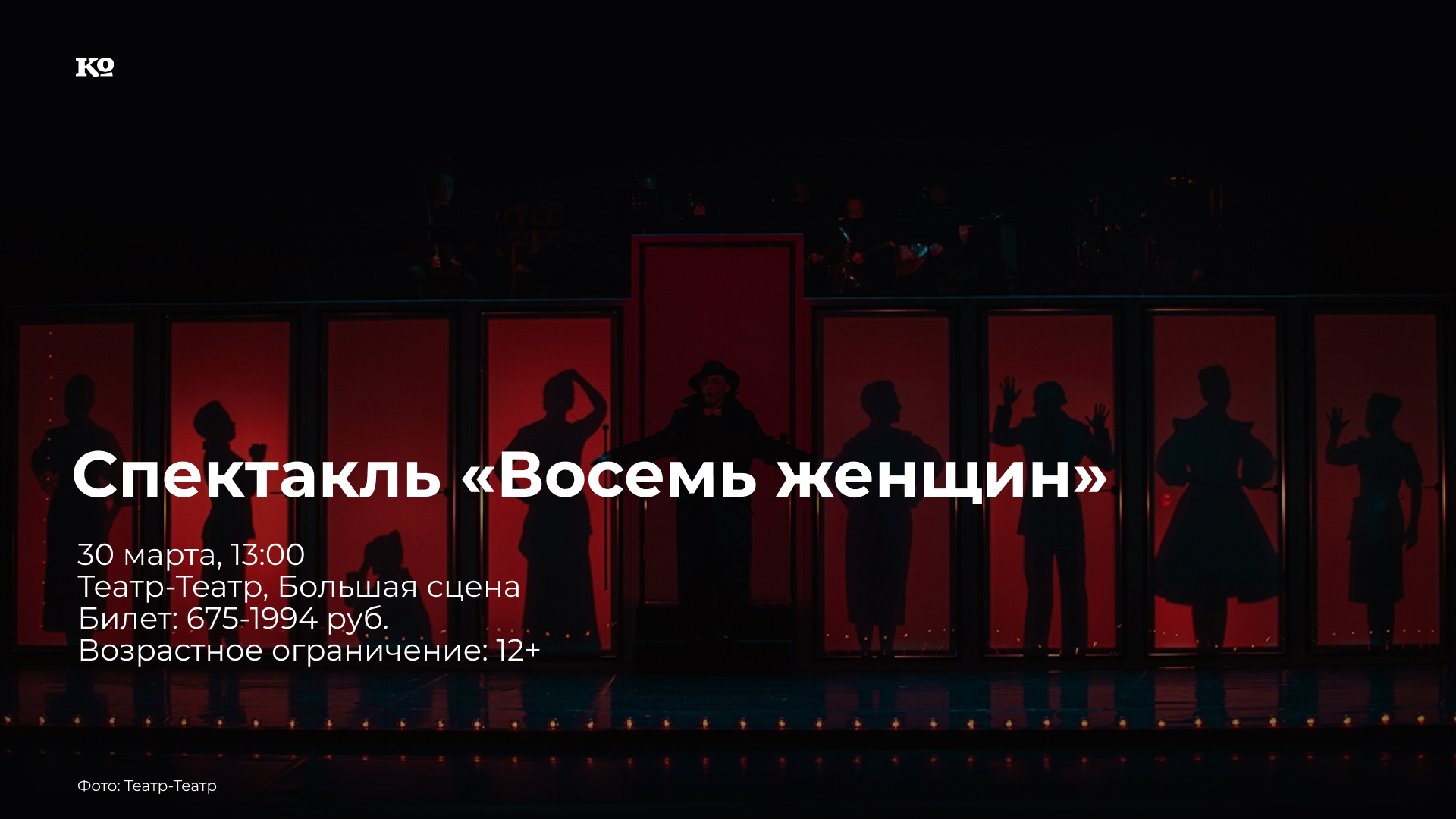 В репертуаре Театра-Театра этот спектакль по пьесе Роберта Тома «Восемь женщин» тоже есть, но на этот раз будет показана версия Красноярского музыкального театра, который приехал на гастроли в Пермь. По сюжету, в доме происходит трагедия — отца, мужа и главу семейства, обнаруживают убитым. Выясняя, что к нему не мог попасть посторонний, женщины приходят к страшному заключению: убийца — одна из них… Режиссёр Джемма Аветисян уходит от привычной трактовки пьесы и совмещает текст с произведениями французского шансона, а сценография отсылает к эстетике чёрно-белого кино 50-х годов и решена минималистично.