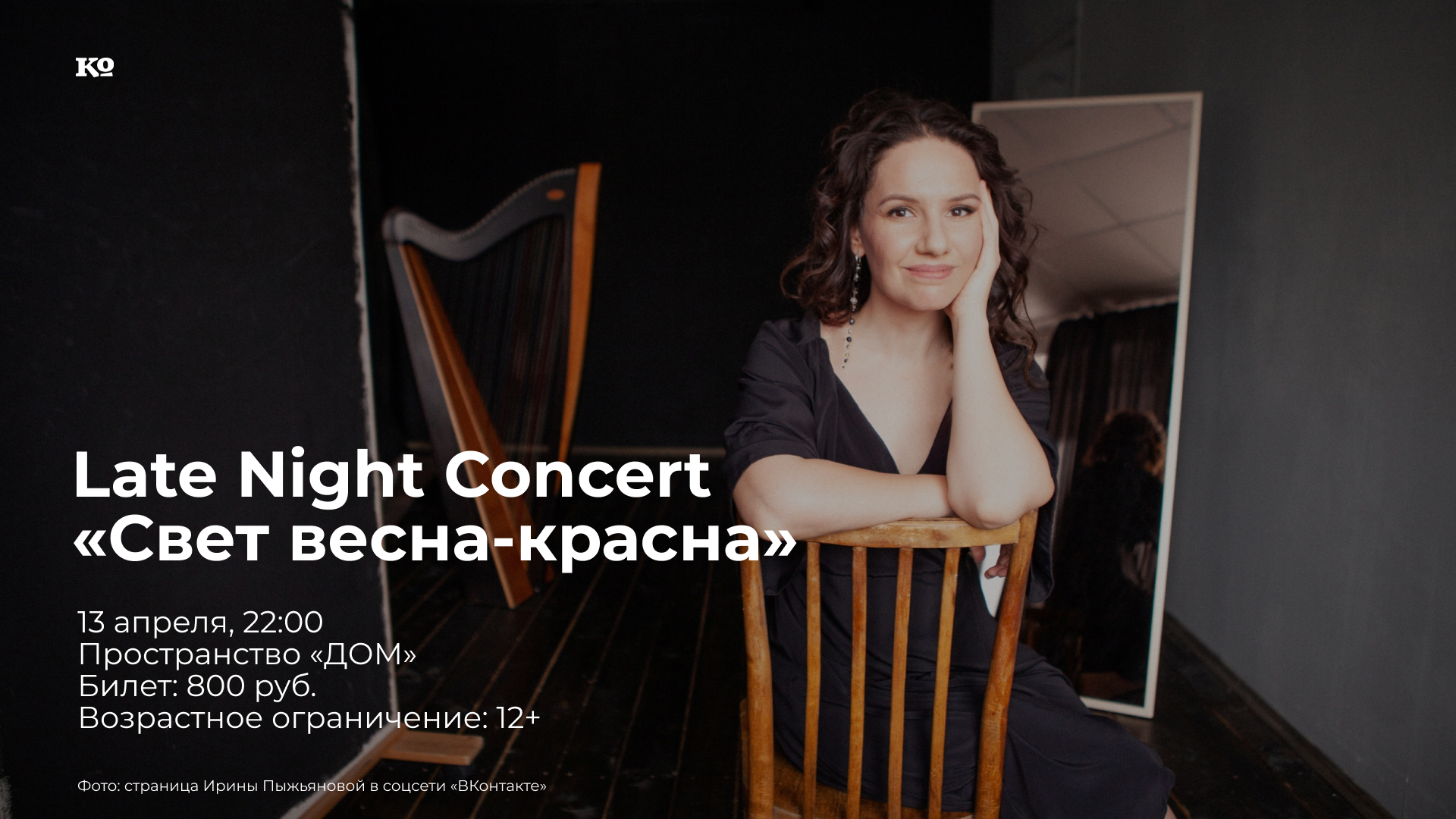 Сольный концерт этновокалистки, арфистки Ирины Пыжьяновой. В программе: весенние обрядовые песни, хороводы и лирика в традиционном звучании и в авторских аранжировках для леверсной арфы и гуслей. Это песни пробуждающейся земли, освобождающихся ото льда рек и весеннего неба. Это давние истории и сюжеты, которые вновь и вновь пересказываются на новый лад, резонируя с настоящим временем и теми, кто его проживает. Как и все концерты в рамках проекта Late Night Concert, выступление Ирины Пыжьяновой будет проходить в уютной атмосфере под мерцание свечей.