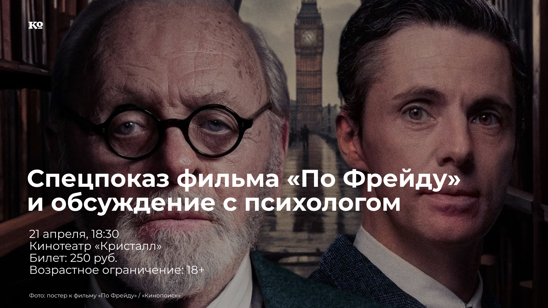 Фильм расскажет историю встречи основателя психоанализа Зигмунда Фрейда и автора цикла повестей «Хроники Нарнии» Клайва Стейплза Льюиса. Сюжет разворачивается накануне Второй мировой войны на одном из последних сеансов учёного. Действие постоянно вырывается за пределы кабинета, переплетая в себе прошлое и настоящее и унося зрителя в мир фантазий. Картина будет идти в «Кристалле» с 18 по 1 мая. В воскресенье, 21 апреля, состоится спецпоказ совместно с центром практической психологии. Фильм представит и обсудит со зрителями Мария Яшина, психолог, КПТ-терапевт.