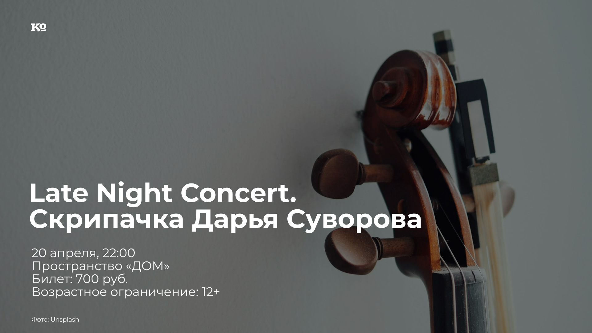 Впервые на Late Night Concert выступит скрипачка Дарья Суворова. Ей будет аккомпанировать пианист Алексей Сучков. Оба они являются артистами симфонического оркестра Пермского театра оперы и балета. В программе концерта: чувственные поэмы Эжена Изаи и Эрнеста Шоссона, на контрасте с которыми прозвучит «Славянский триптих» Николая Сидельникова — «За горизонтом скрылось солнце берендеев», «В стране журавлей», «Метель заметёт все следы». Как и все концерты в рамках проекта Late Night Concert, выступление артистов будет проходить при свечах.