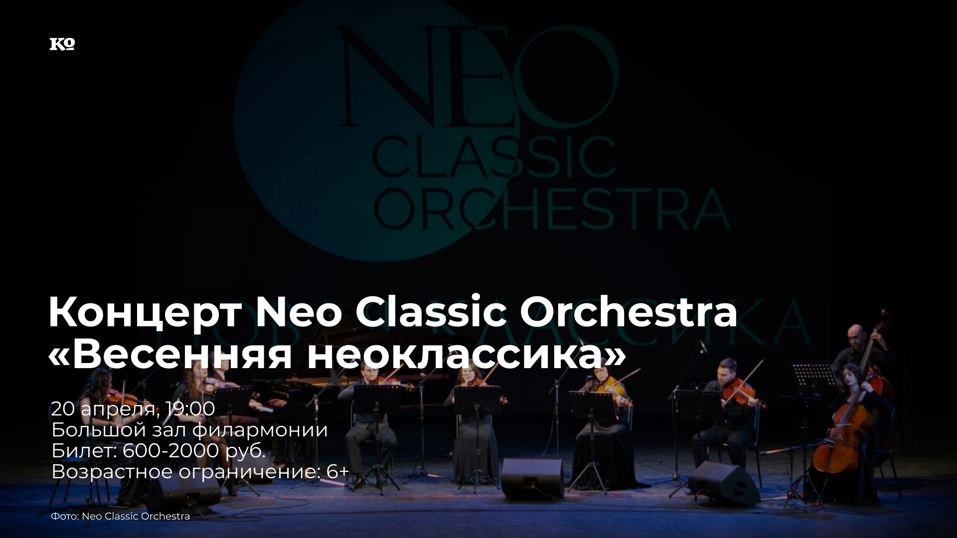 Neo Classic Orchestra — молодой коллектив из Екатеринбурга, активно гастролирующий по всей территории России. Своей основной задачей артисты видят популяризацию современной классической музыки. В программе «Весенняя неоклассика» прозвучат полюбившиеся зрителю саундтреки из известных фильмов «Интерстеллар», «1+1», «Уэнсдей», «Дюна», «Начало», «Амели» и других картин, а также новые весенние неоклассические произведения.