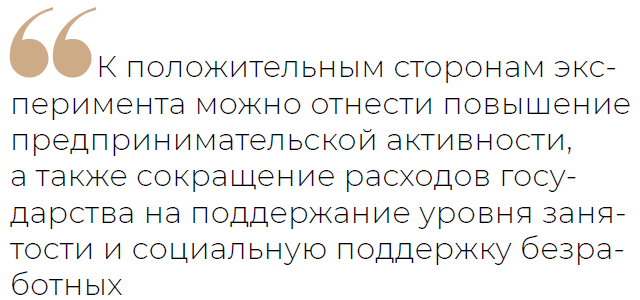 По словам Татьяны Букиной, к положительным сторонам эксперимента можно отнести повышение предпринимательской активности, а также сокращение расходов государства на поддержание уровня занятости и социальную поддержку безработных. И в дальнейшем при развитии этого налогового режима при соответствующем госрегулировании он может стать источником гибкого и адаптивного поведения населения на рынке труда и позволит рассчитывать на более устойчивое развитие экономики страны.