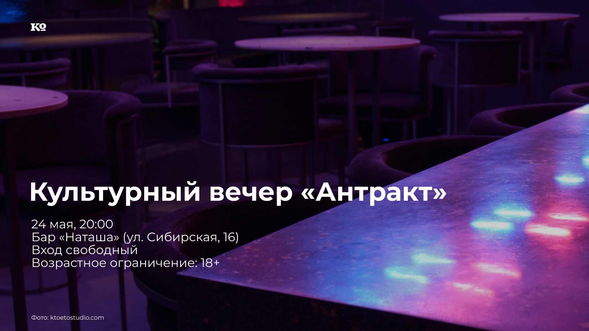 В пермском баре «Наташа» сегодня запланирован культурный вечер «Антракт». В программе: фрагмент из моноспектакля актрисы Люси Прохоренко «Пьяный «космонавт», выступления оперной певицы и контрабасиста, DJ-сет на виниле и околосветские беседы. В буфете будут угощать настойками, фирменными бутербродами и круассанами от кондитерской «Классика жанра».