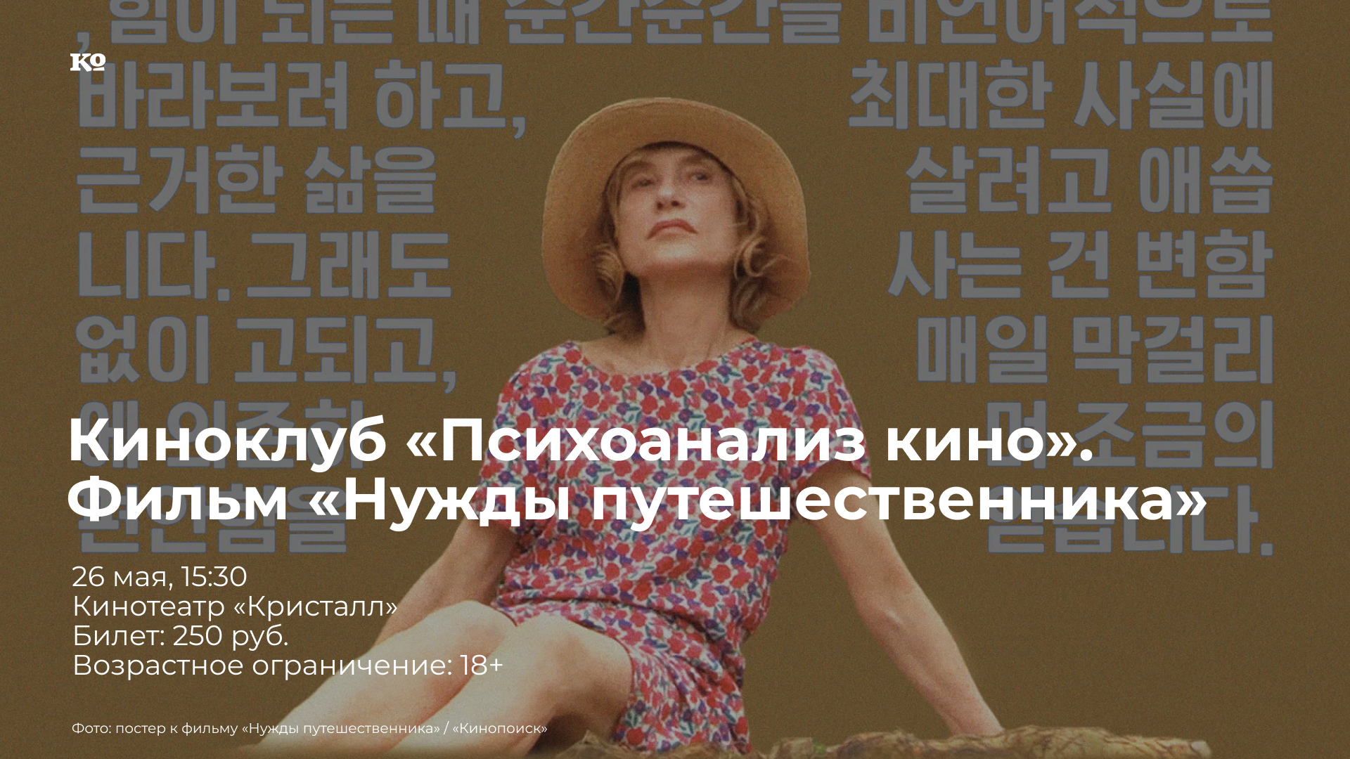 На предстоящей встрече киноклуба «Психоанализ кино» участники посмотрят южнокорейский фильм «Нужды путешественника» и на его примере разберут с психоаналитиком Мариной Старовойтовой тему лингвистических метаморфоз. Картина «Нужды путешественника» режиссёра Хон Сан-су с Изабель Юппер в главной роли вышла в российский прокат на этой неделе. Её герои заняты не только непременным распитием соджу, но и культурно-лингвистическим обменом — героиня Юппер учит корейцев произносить французские слова и просит прочитать ей стихотворения, выбитые на огромных валунах. Иностранный язык и чуждая культура являются одной из возможностей ускорить процесс самопознания. Киноклуб приглашает вместе наслаждаться неспешным кино и искать ответы на непростые, но важные вопросы.