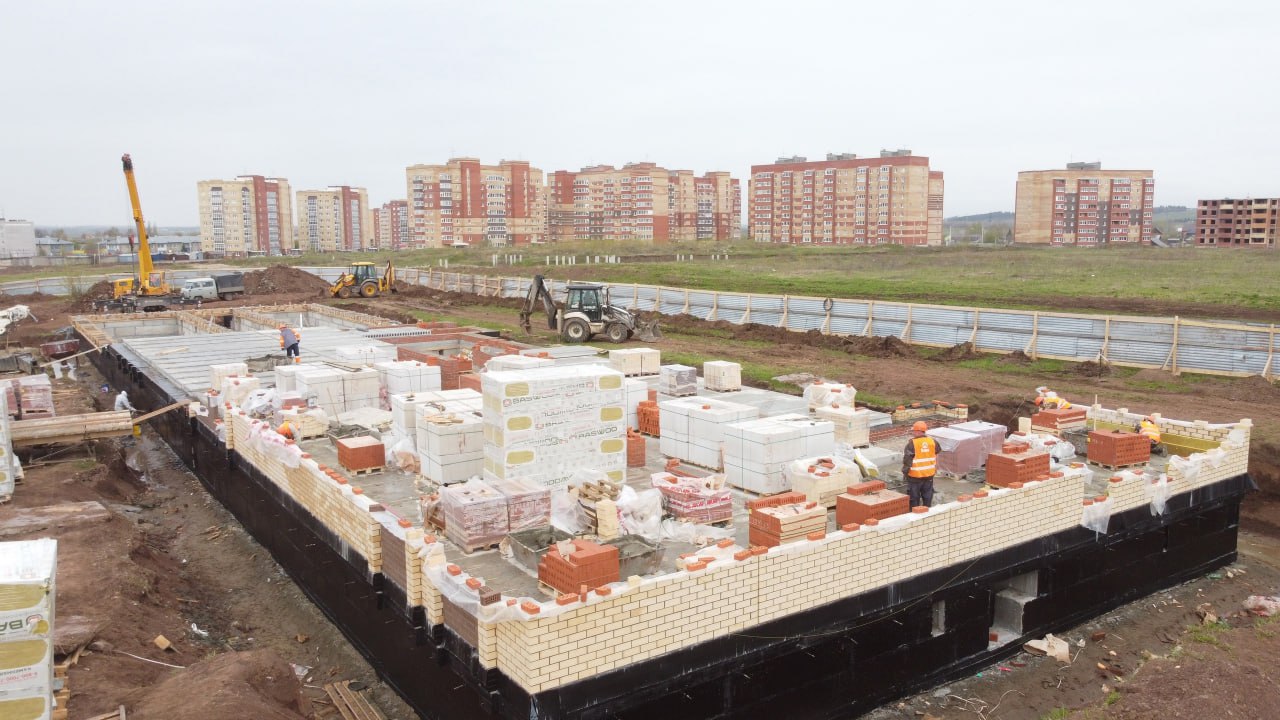 Для нового медучреждения уже подготовлен фундамент, рабочие возводят первый этаж. Параллельно выполняются работы по устройству наружных сетей водоснабжения, канализации и тепловых сетей.