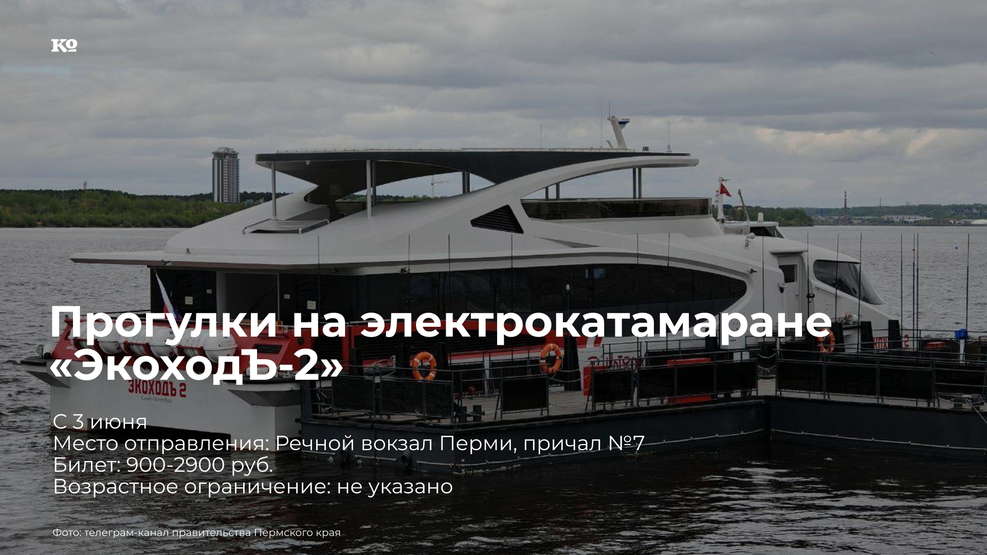 С сегодняшнего дня в Перми начинает курсировать электрокатамаран «ЭкоходЪ-2». Помимо регулярных рейсов до Закамска и обратно, он будет ежедневно выполнять прогулочные рейсы по Каме: с понедельника по четверг — в 16:00, с пятницы по воскресенье — в 12:00 и 20:00. Также запланированы рейсы с тремя разными экскурсионными программами: «По волнам истории Перми» (пн-чт 18:00, пт-сб 18:00, вс 14:00 и 18:00), «Мосты Перми» (пт-сб 14:00 и 18:00, вс 16:00) и «Огни большого города» (пн-чт 20:00). Кроме того, по пятницам и субботам в 20:30 будет отправляться рейс с музыкальной программой «Музыка на камских волнах».