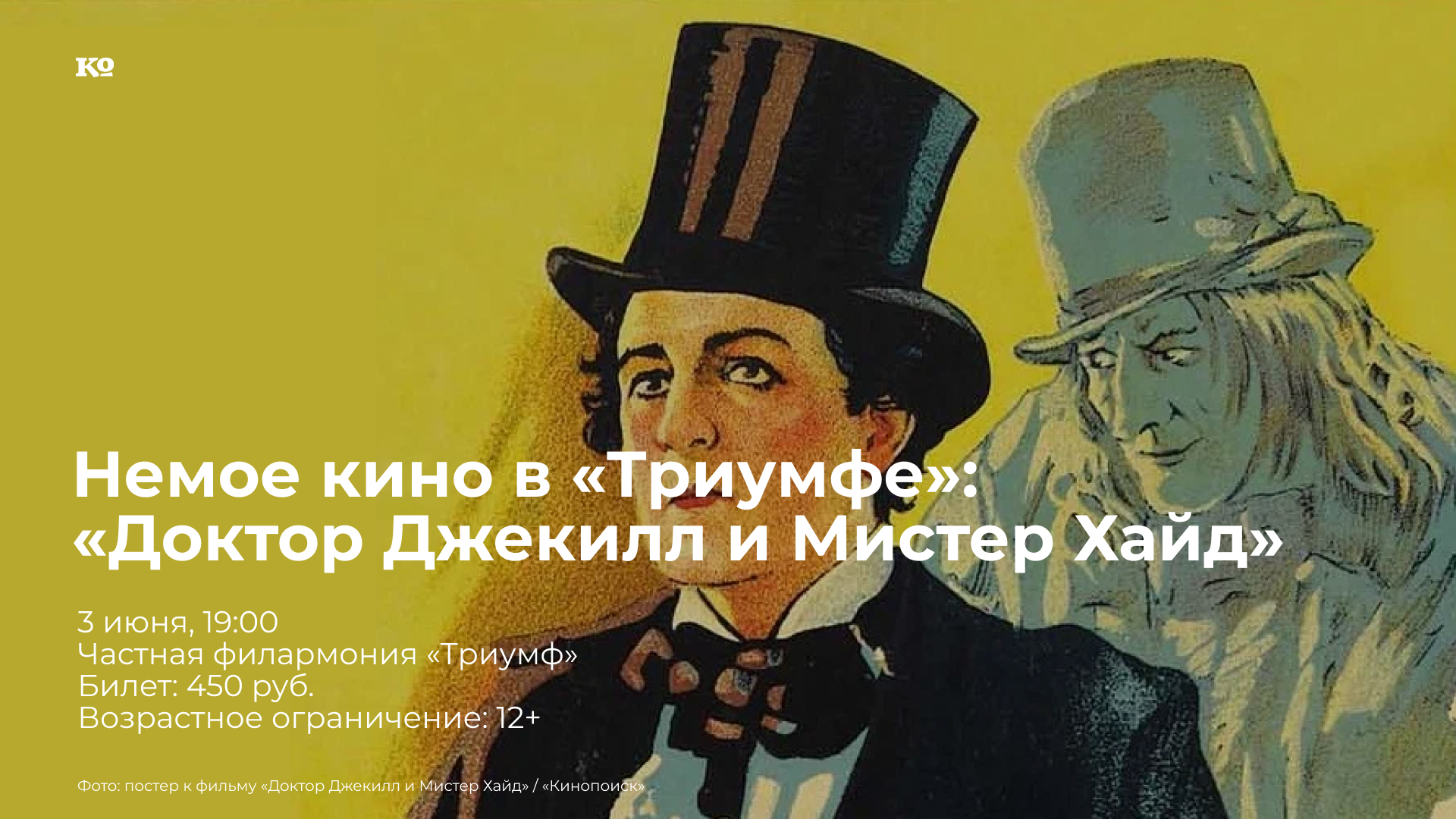 Проект «Немое кино в Триумфе» позволяет зрителям раз в месяц прикоснуться к ушедшей эпохе известного пермского кинотеатра, погрузиться в его особенную атмосферу, познакомиться с золотыми хитами немого кинематографа и поделиться своими впечатлениями о старом кино. «Доктор Джекил и мистер Хайд» — немой фильм ужасов 1920 года, выпущенный на студии Paramount. Фильм является экранизацией повести «Странная история доктора Джекила и мистера Хайда» Роберта Луиса Стивенсона. Зловещего мистера Хайда сыграл знаменитый актёр Джон Бэрримор. Эта роль вошла в золотую коллекцию мирового кинематографа и служит примером актёрского мастерства. Во время демонстрации картины пианист Александр Колесников выступит в роли самого настоящего тапёра и сопроводит фильм стилистически и эмоционально соответствующей импровизационной музыкой.