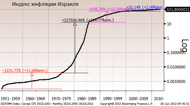 С начала 70-х и до середины 80-х в Израиле была большая инфляция. График ниже отражает индекс CPI в логарифической шкале (2012 г. =100 п.).