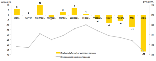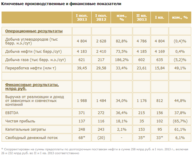 «Роснефть» опубликовала совместные с «ТНК-ВР» финансовые показатели по МСФО за второй квартал и первое полугодие. Объединенной компании удалось улучшить практически весь спектр показателей, как финансовых, так и операционных, за исключением чистой прибыли во втором квартале. Прибыль по сравнению с первым полугодием выросла на 18,1% до 137 млрд. руб., правда в квартальном выражении упала почти на 66% из-за отрицательных курсовых разниц, которые оцениваются в 55 млрд. руб. Ниже на графике, импортированном из презентации «Роснефти» по итогам первых двух кварталов, представлена динамика обменного курса и размер прибыли/убытка от курсовых разниц. Из-за ослабления рубля переоценка иностранного кредита (в $) привела к падению чистой прибыли. Выручка при этом выросла на 34% до 2 трлн. руб., показатель EBITDA увеличился на 36,7% до 371 млрд. руб. В презентации также уточняется, что существенным образом вырос свободный денежный поток до 68 млрд. руб., хотя в первом квартале он принимал отрицательные значения. Синергетический эффект от присоединения ТНК-ВР к «Роснефти» оценивается И. Сечиным в 12 млрд.$
