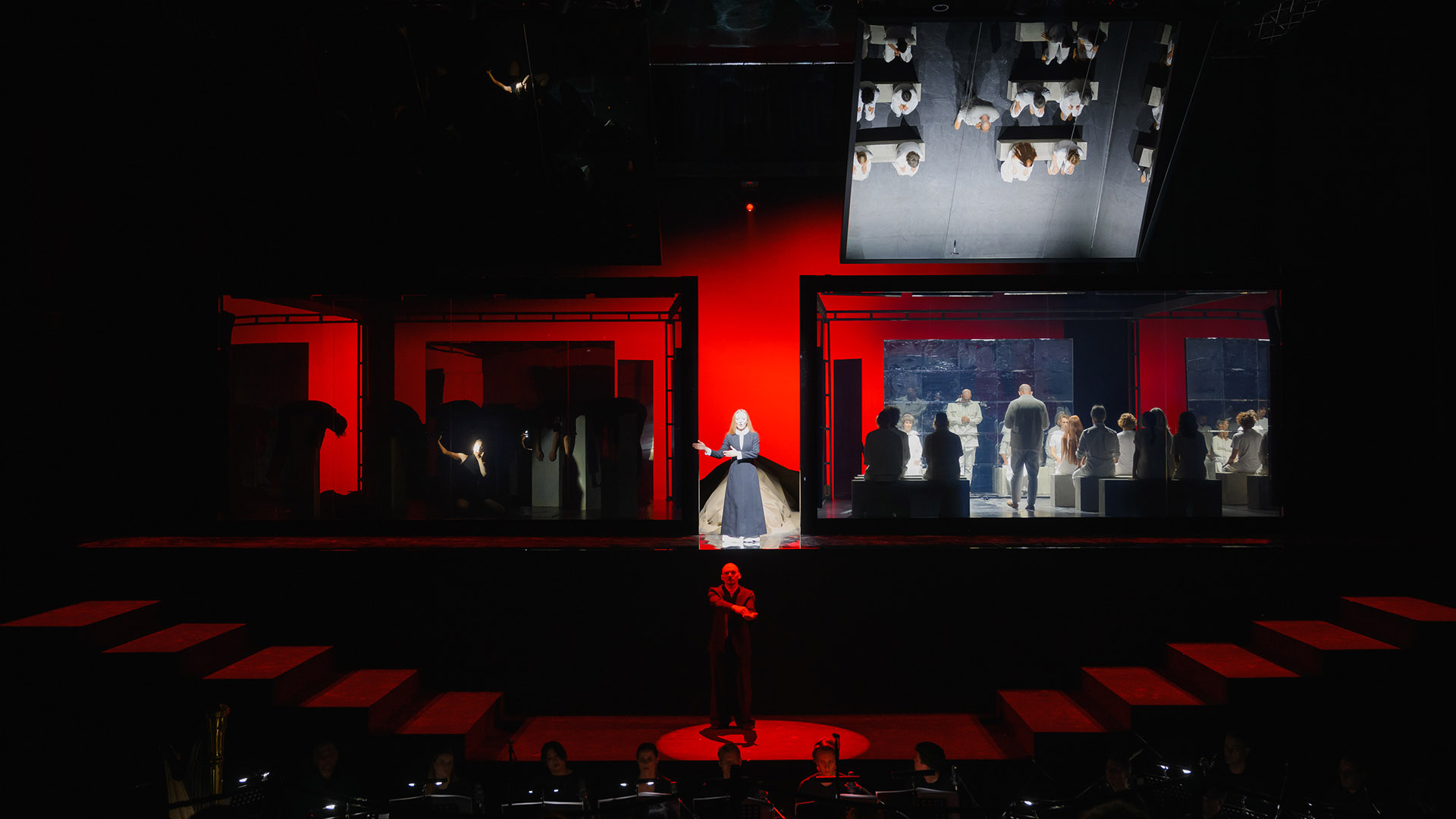 Опера вообще-то камерная: в ней два солиста, хор и не очень большой оркестр, однако постановка превратила её в масштабное зрелище, прежде всего благодаря пластическим этюдам в исполнении musicAeterna Dance. Пока герои «Страсти» — безымянные Он и Она — бесконечно переживают на авансцене своё неизбежное, как смерть, расставание, на заднем плане в двух окнах-«аквариумах» происходит ещё несколько мини-спектаклей, явленных в виде активной физической драмы, отчасти пантомимы, отчасти танца (хореограф Анастасия Пешкова). Вот мать, усталая, замученная бытом, раздражённо отмахивается от прелестного кудрявого мальчишки, который, вырастая, становится монстром-разрушителем; вот в одном из «аквариумов» люди в белом возводят какую-то конструкцию из больших, но лёгких блоков, а в соседнем окне люди в чёрном молотят молотками по прозрачным перегородкам, всё круша…