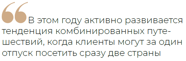 Эту тенденцию отмечают и другие представители турбизнеса. Елена Каменева также отметила появившиеся нестандартные туры, такие как посещение Таиланда и Сингапура в рамках одного отпуска. Кроме того, по её словам, многие пермяки не отказываются и от отдыха на территории региона и бронируют путёвки в местные санатории.