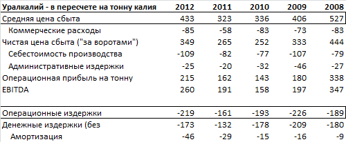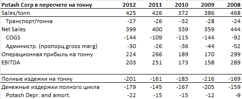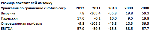 Показатели выручки и издержек напрямую не сравнимы, если у компарий разное «транспортное плечо». Например, если Potash Corp. продает удобрения в порту (похоже, что так и есть, поскольку стоимость транспорта низка), а «Уралкалий» — в конечных точках. Поэтому следует обращать внимание на показатели прибыли в пересчете на тонну.