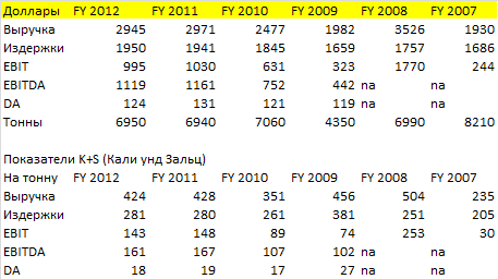 Итак, в 2012 году K+S получал EBITDA в $161/тонну и EBIT $143/тонну. Итак, если цены калийных удобрений упадут на $143, то K+S начнет получать операционный убыток, а если упадут больше чем на $161, то немцам придется останавливать производство, поскольку оно станет денежно убыточным (безусловно, все производство не станут останавливать, какая-то часть сможет работать на ближние рынки, т.е. на ЕС).