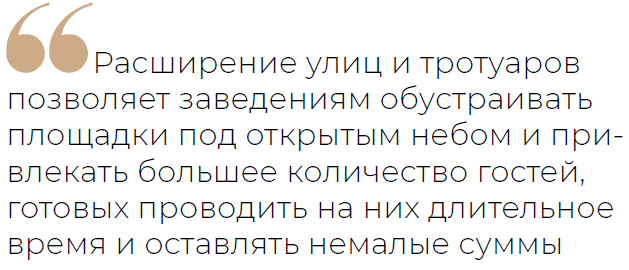 По мнению владельца ресторанов «Улитка» и «Маркс» Олега Ощепкова, здесь также не последнюю роль играет изменение городского пространства в центральной части Перми. Расширение улиц и тротуаров позволяет заведениям обустраивать площадки под открытым небом и привлекать большее количество гостей, готовых проводить на них длительное время и оставлять немалые суммы.