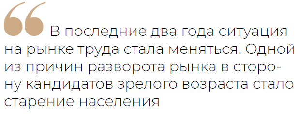 Как отмечает Марина Петряева, компании, которые существуют на рынке более 10 лет, сейчас, в отличие от прежней практики, стремятся принимать на работу кандидатов 40+. Особенно когда речь идёт о процессах, в которых есть чёткий регламент и не требуется творческий подход. По её мнению, этот тренд уже сложился и теперь в выигрыше окажутся те компании, которые быстро поймут, что надо перестроиться на такой подход вместо утопичного ожидания молодых и опытных кандидатов.