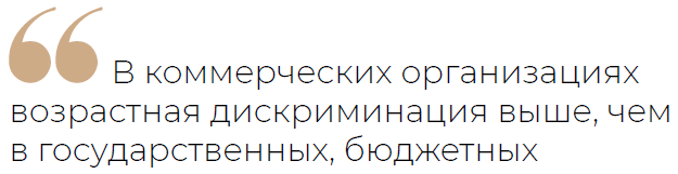 С этими фактами связан и ещё один: в коммерческих организациях возрастная дискриминация выше, чем в государственных, бюджетных. В бюджетных организациях (особенно учреждениях культуры) часто невысокий уровень заработной платы, поэтому привлечь молодых сотрудников достаточно трудно.