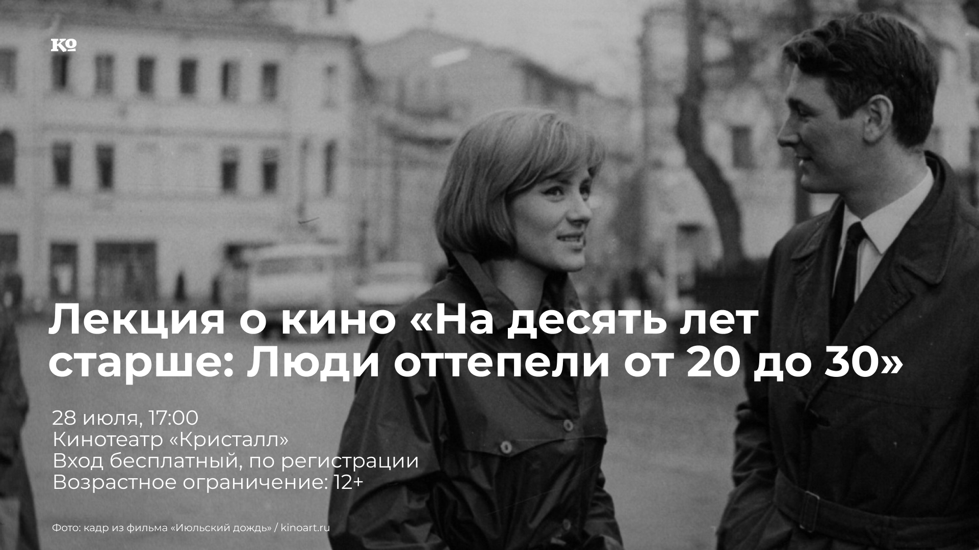 Июль — прекрасный месяц, чтобы поговорить об оттепельном кино и о картине Марлена Хуциева «Июльский дождь». Лекцию проведёт историк кино, главный редактор журнала «Искусство кино» Станислав Дединский. На встрече обсудят, как (и зачем?) Марлен Хуциев создавал свои известные работы, с какими новыми проблемами сталкивались молодые киногерои к концу 1960-х и при чём здесь «новое мировое поветрие» — некоммуникабельность, которой советские кинокритики пугали зрителей и читателей тех лет. После лекции состоится показ фильма «Июльский дождь» (0+). Героям фильма — примерно тридцать. Очень часто именно в это время у людей наступает период пересмотра уже выработанных ранее позиций. К такому пересмотру и приходит Лена, героиня фильма. Ей многое надо обдумать заново... Регистрация на лекцию и кинопоказ — на сайте Пермской синематеки.