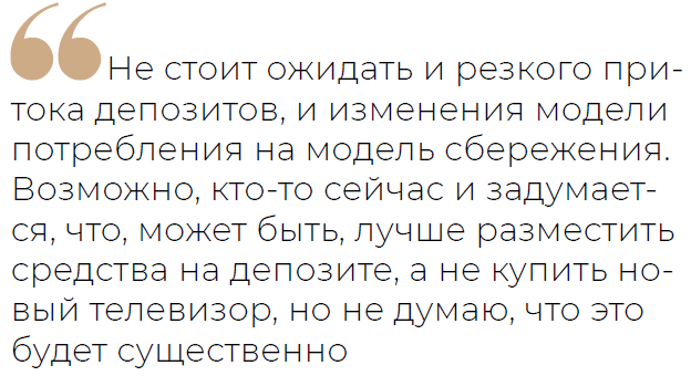 Поэтому, на мой взгляд, не стоит ожидать и резкого притока депозитов, и изменения модели потребления на модель сбережения. Возможно, кто-то сейчас и задумается, что, может быть, лучше разместить средства на депозите, а не купить новый телевизор, но не думаю, что это будет существенно.