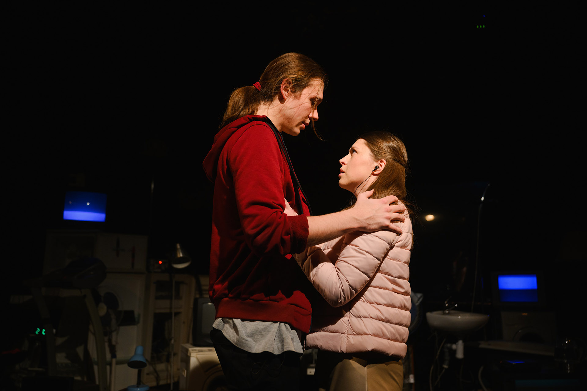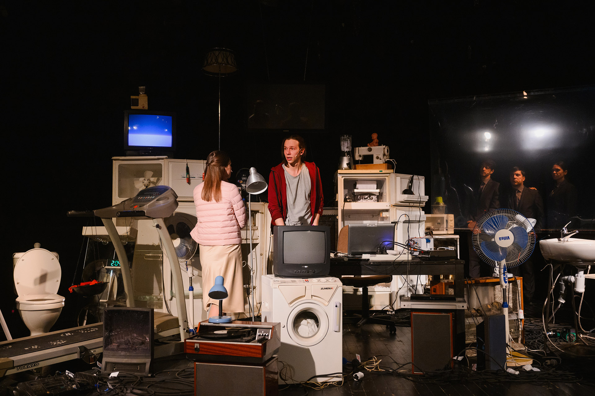 Люди, машины — в этом спектакле и не разберёшь, кто где. Трое курьеров, которые приносят главному герою — «админу» Серёже — загадочную посылку, не вполне люди, скорее, функции. Впрочем, эти метафизические персонажи (Владимир Котляревский, Степан Сопко и Юлия Никитина) совмещают в себе многие сущности: они вызывают очевидные ассоциации с Троицей (пожилой отец, юный сын и девушка-дух) и в то же время играют роль адских искусителей.
