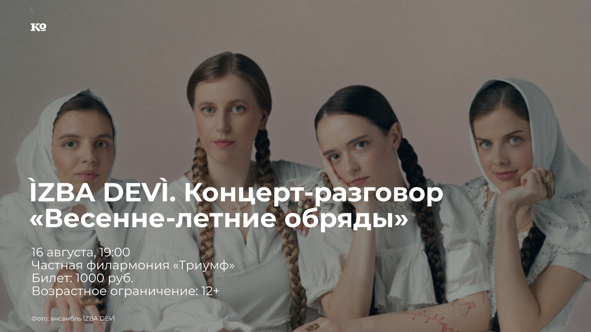 Вокальный фольклорный ансамбль ÌZBA DEVÌ — это четыре девы из московской группы Hodíla ízba. В рамках программы «Лето в "Триумфе» они выступят с концертом-разговором, во время которого расскажут про обряды весенне-летнего цикла. Зрители узнают о вождении стрелы, похоронах кукушки и других необычных обрядах. Девушки не только расскажут, но и споют обрядовые песни с большой любовью к аутентичному фольклору.