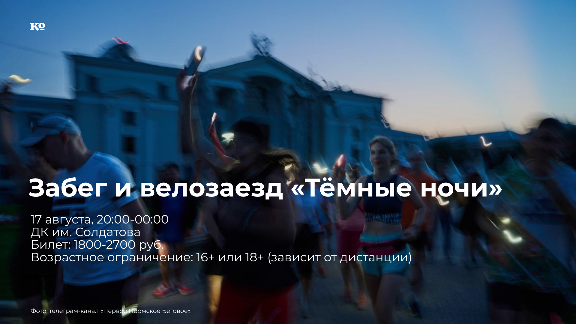 «Тёмные ночи» — первый ночной забег и велозаезд в Перми. Это не просто спортивное событие, а яркая вечеринка для спортсменов-любителей и уникальный городской беговой и вело-маршрут. Будут три дистанции для бегунов — на 2, 5 и 10 км, для начинающих и профи, а также дистанция на 10 км для любителей велогонок. После участников ждёт танцевальный флешмоб от Бони и Кузьмича, выступление группы SPLIT, барабанное шоу «Ритмикон» и классная вечеринка с музыкой и танцами. С собой необходимо иметь паспорт, медицинскую справку о допуске к забегу или велогонке (подробнее о справке можно прочитать тут). Регистрация на забег — по ссылке.