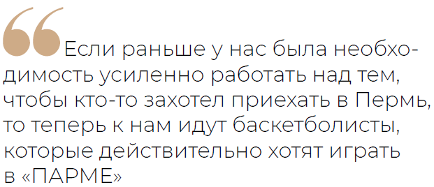 «ПАРМА» сейчас стала клубом, в который стремятся игроки. Если раньше у нас была необходимость усиленно работать над тем, чтобы кто-то захотел приехать в Пермь, то теперь к нам идут баскетболисты, которые действительно хотят играть в «ПАРМЕ», прогрессировать как лично, так и с клубом в целом. Могу сказать, что от обновлённой команды мы ждём хорошего выступления в новом сезоне.