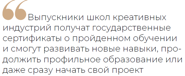 Выпускники школ креативных индустрий получат государственные сертификаты о пройденном обучении и смогут развивать новые навыки, продолжить профильное образование или даже сразу начать свой проект, а лучше — то и другое одновременно!