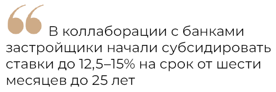 Первое, что сделали девелоперы, — разработали собственные варианты рассрочки с низким первоначальным взносом и низкими ежемесячными платежами, поддерживает эту мысль директор компании «Эстейт Групп» Алексей Терентьев. По его данным, в коллаборации с банками застройщики начали субсидировать ставки до 12,5—15% на срок от шести месяцев до 25 лет.