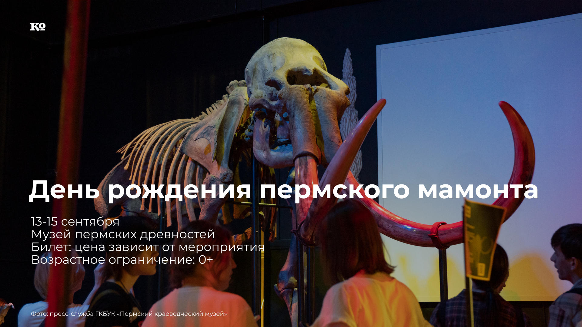С 13 по 15 сентября в Музее пермских древностей пройдут мероприятия, приуроченные ко Дню рождения пермского мамонта — «визитной карточки» музея. Скелет мамонта был найден весной 1927 года в Верещагинском районе. В этом году одному из самых любимых экспонатов пермяков исполняется 97 лет. В честь этого музей подготовил тематическую программу. Для посетителей будут организованы образовательные занятия о мамонтах, перфоманс с переодеванием в наряды первобытных людей, а также «Ночные сказки о мамонте» — специальная программа для тех, кто мечтал оказаться в музее в темноте, с экскурсией при свете фонарика и загадочными историями. Расписание событий и билеты — на сайте Пермского краеведческого музея.