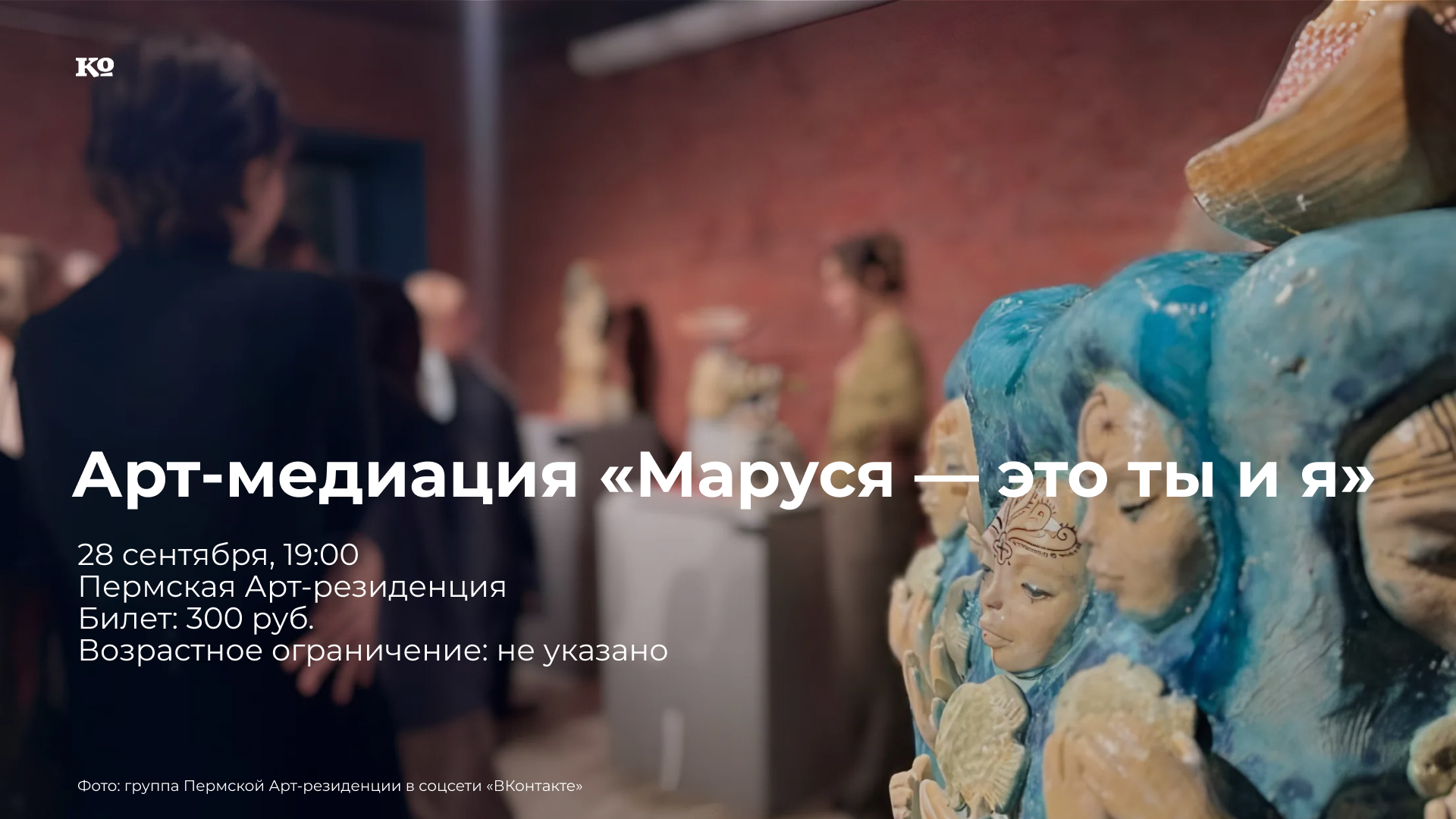 В рамках выставки керамики «Создание», которая сейчас работает в Пермской Арт-резиденции, организована серия арт-медитаций. Медиатор и педагог Дарья Гусева в формате диалога знакомит гостей со смыслами работ автора выставки Ольги Ладкиной. Формат медитации предполагает полное вовлечение зрителя в процесс — не просто смотреть и слушать, а говорить и участвовать. Ближайшая встреча будет посвящена ключевому образу экспозиции — Марусе. Участники поразмышляют, зачем быть Марусей и почему это важно. Необходима предварительная регистрация по ссылке или по тел. 8-995-910-92-72.