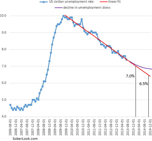 Предлагаем взглянуть на график безработицы с двумя возможным трендами (позаимствовано с pragcap.com). При текущем тренде на снижение безработицы уровень 7% может быть достигнут в конце 2013 г., но, возможно, скорость снижения безработицы замедлится, тогда сбудутся ожидания Бернанке.