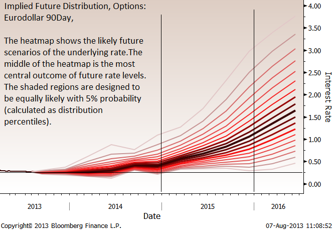 Сворачивание QE не означает радикального изменения условий на финансовых рынка. Более важен уровень в 6.5% — крайне вероятная точка с которой ФРС может пойти на первое повышение ставок. Экстраполяция тренда указывает, что это может случиться в конце 2014 г., ФРС ранее обещал не повышать ставки до 2015. Рынки деривативов считают, что повышение ставок начнется в 2015 г., так что к началу 2016 г. ставка будет около 1%.